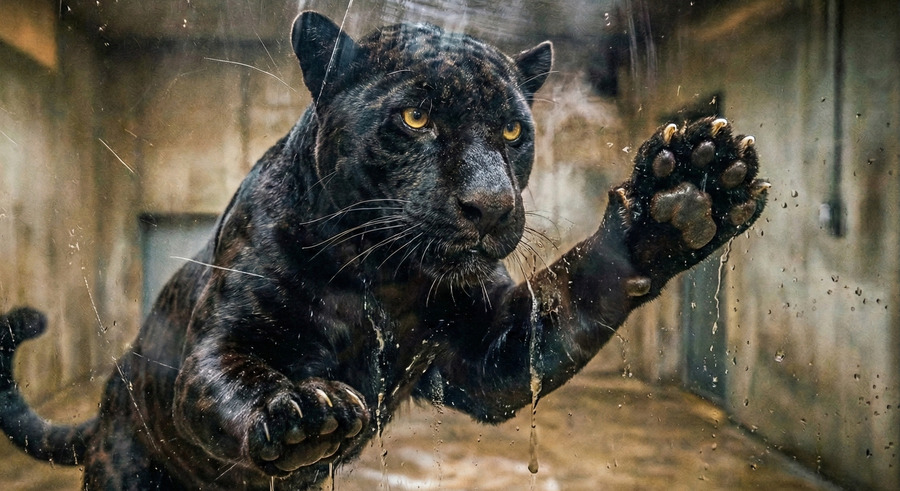 Luna was behind a glass partitioned room at the back of the laboratory. Weighing more than 100 kg, she was so large that her cage looked smaller than it was. She no longer looked like a kitten. Dakota approached the glass and called out, “Luna. Luna slowly presses her paw against the glass, her amber eyes catching Dakota’s. Dakota’s paw alone is enough to make Dakota look like a kitten. The paw alone is as big as Dakota’s face. It is a cold goodbye through the glass. Tears fell from Dakota’s eyes.