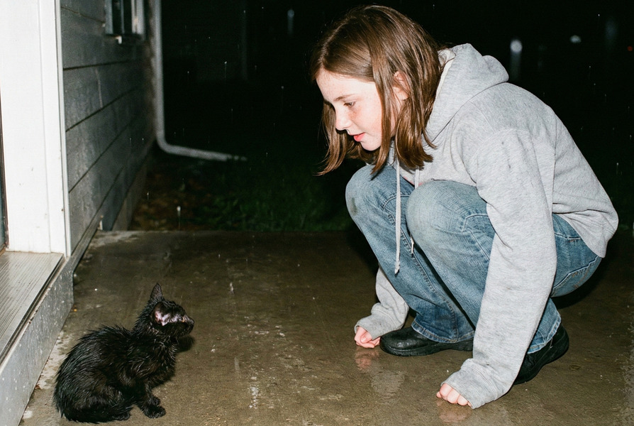 Amid the fierce rain pounding against the window, a faint cry reached their ears from somewhere. Dakota hurriedly opened the door to find a mud-covered black shadow there. When lifted up, a faint warmth radiated from its frozen body. Finally cradled in the family’s arms, the trembling ceased.