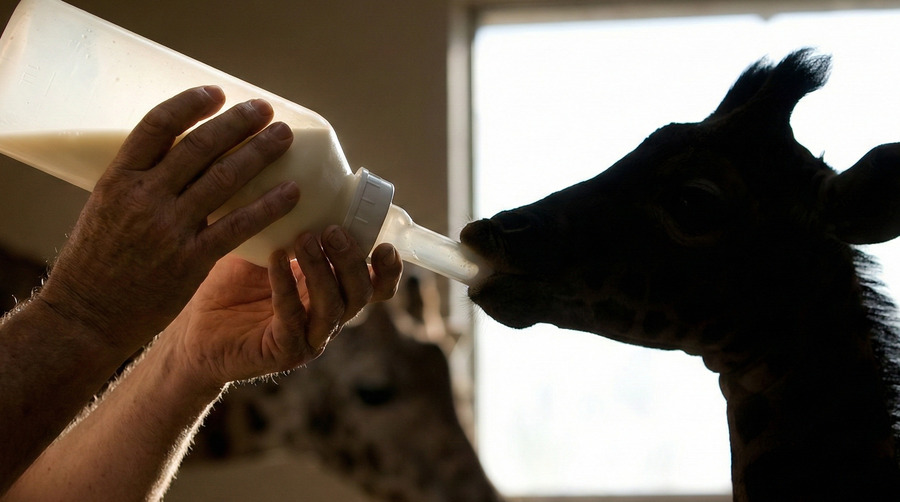 The baby giraffe keeps standing by Bella. She is looking for her mother’s milk. However, Bella does not try to get him to nurse. When the baby approaches, she turns her body to avoid him. Mike has made a decision. Artificial feeding must begin. If the baby does not get colostrum within a few hours of birth, it will die. Mike takes the giraffe’s colostrum from the refrigerator. He put it in a bottle and warmed it up. Jessica gently guided the baby. The baby instinctively looks for the nipple of the bottle.