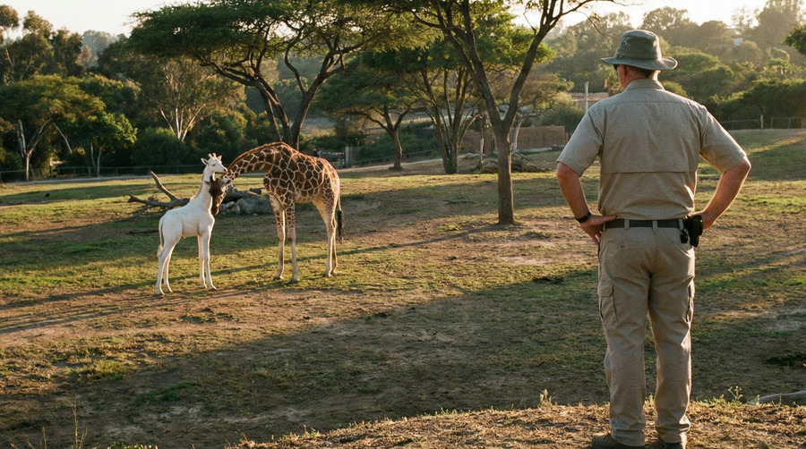 One spring morning a year later, Mike went to the giraffe house as usual. The morning sun was shining and Hope was grazing near Bella. Her pure white body glistened in the morning sun. At over three meters tall, she has grown into a magnificent young giraffe. Mike leaned against the fence and gazed at them. Exactly one year had passed since that night. Mike still remembers how nervous and anxious he was at the time. But now Hope is alive and well. There is no greater joy.