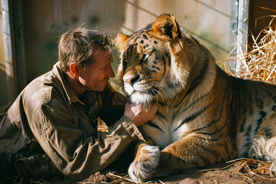 One day, Mark was resting in Leo’s breeding area. Then Leo slowly approached and lay down next to Mark. His huge body snuggled up to Mark like a kitten. Mark patted Leo on the head. You are so sweet,” Leo responded throatily, “the world’s largest feline, weighing in at over 450 kilograms. But his heart was still the same as the little kitten he had found in the meadow that day. Mark felt happy. He was happy to have met Leo.
