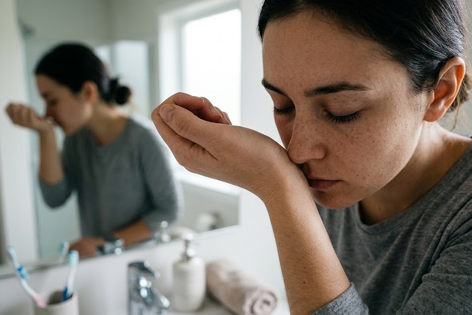 6. Lick your wrist, dry it for 10 seconds, and smell it.