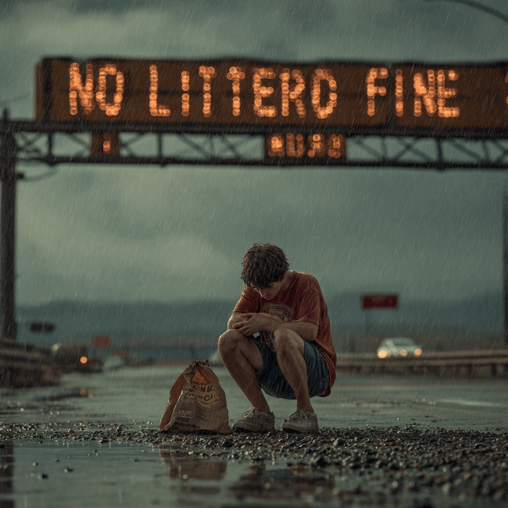 The motel manager warned him. “It’s monsoon season tonight. It’s dangerous out there.” But Nate had nowhere else to go and took shelter under the bridge. He placed his belongings on wet cardboard and hugged his knees. Above him, a sign read: “NO LITTERING — $1000 FINE.” Raindrops blurred the letters, seeming to look down on him with irony.